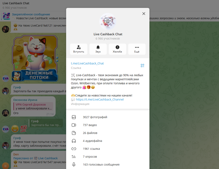 - Live Cashback Chat — группа, где можно общаться и задавать вопросы админам.