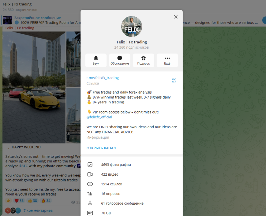На Телеграмм канале Felix | Fx trading схему обмана распознать может быть не так просто, хоть она и очевидна. Админ показывает бесплатным контентом, что он компетентный в сфере трейдинга и торговли на Форекс. Автор публикует общую информацию (на самом деле ее можно найти в интернете и пользы она не несет), также он часто постит сигналы.