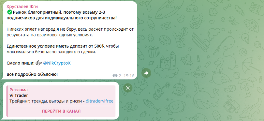 Кроме этого, здесь присутствуют и рекламы других сомнительных тгк, связанных с трейдингом или инвестициями в криптовалюту.
