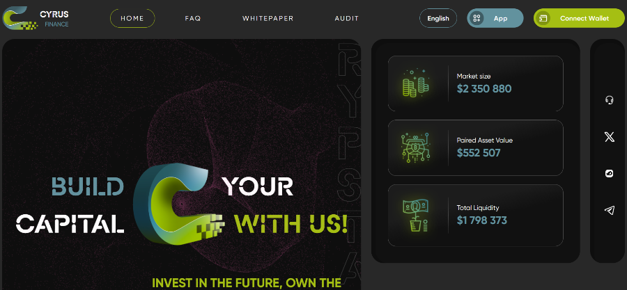 Проект Cyrus Finance представляет собой сайт-одностраничник на английском языке. Перевод на русский разработчики не предусмотрели. На момент февраля 2026 года сайт находится на стадии разработки, так как много активных кнопок попросту не работают. По данным Whois сайт в этом виде функционирует только с 30 января 2026 года.